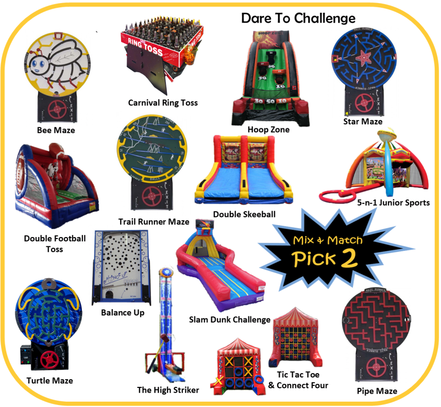 Select from a wide range of fun games, including Bee Mave, Carnival Ring Toss, Hoop Zone, Double Maze, Double Football Toss, Trail Runner Maze, Double Skeeball, 5-in-1 Junior Sports, Balance Up, Slamdunk Challenge, Turtle Maze, High Striker, Tic Tac Toe, and Connect Four.