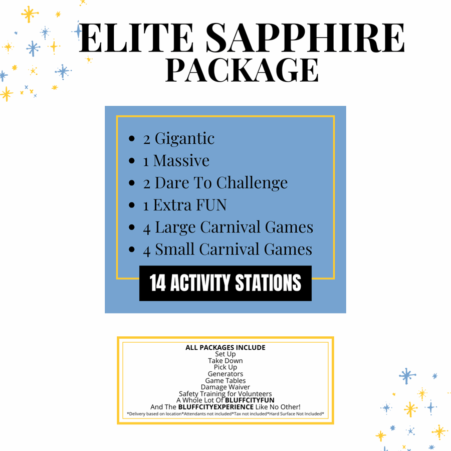 The Sapphire Package is ideal for hosting a lively and exciting event. With 10 activity stations, featuring 2 Big Enough, 2 Small Scale, 3 Dare To Challenge, and 3 Extra FUN activities, your guests will be entertained with a wide range of thrilling and engaging experiences. This package also includes key services such as setup, takedown, equipment pickup, generators, and a damage waiver, plus FREE safety training for volunteers. The Sapphire Package brings plenty of BLUFF CITY FUN and an unforgettable BLUFF CITY EXPERIENCE to make your event truly memorable