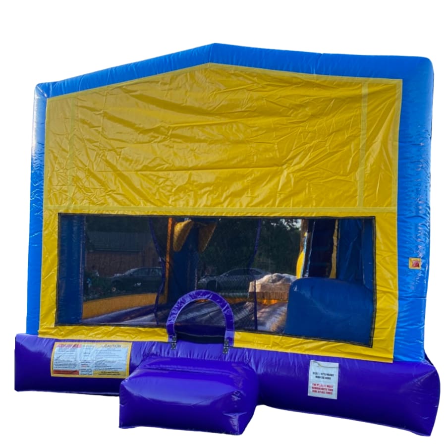 Our Big Enough fun bouncing house inflatable, reaching a height of 14.5 feet, a width of 15.75 feet and length of 20 feet, is a Large blue and yellow simple Bounce House with an slide included on the inside and a basketball hoop. Suggested ages are 3 and under to 13. This inflatable is great for uses at school events, backyard events, and children parties for bouncing fun !