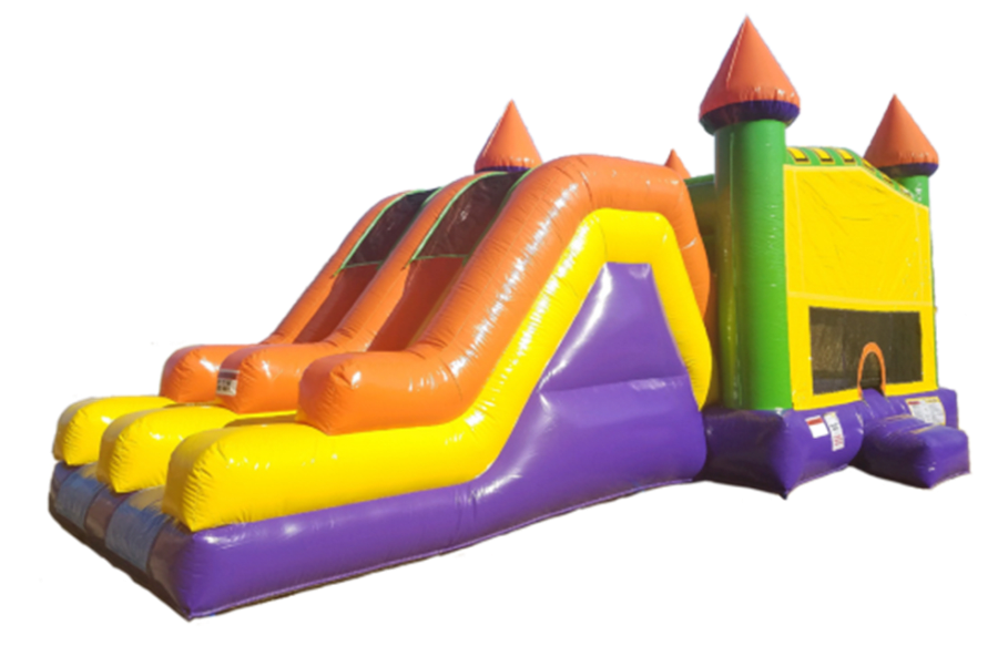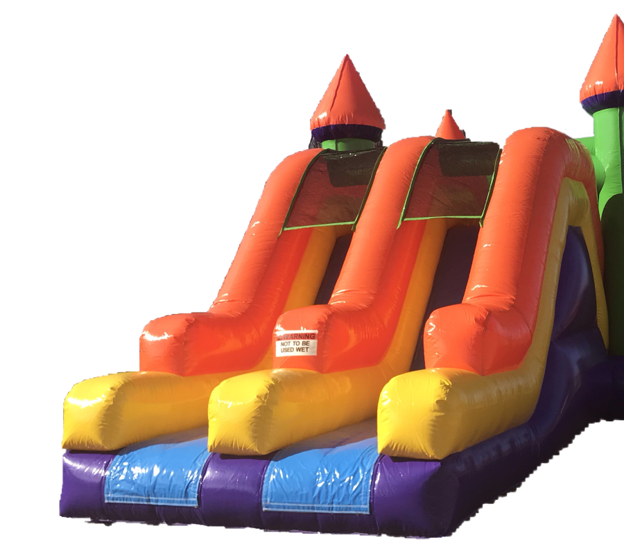 Our Massive Dry Double Slide Bouncer reaches a height of 16 feet, a width of 14 feet, and the length of 30 feet. This bouncer features a large jumping area with basketball hoop. The double slides equals double the fun for your guests. This inflatable is simple yet great for all ages and a plethora of events for a good time either way