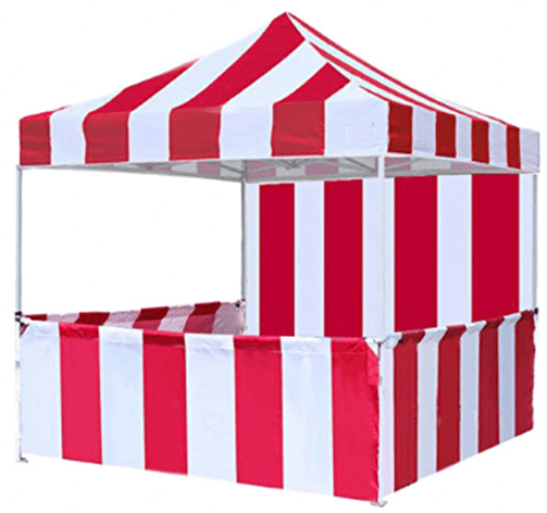 Premium Carnival Tent includes high quality premium vinyl or outdoor cloth striped or solid color with 3 half walls and one full wall. This 10” x 10” tent is perfect for outdoor sports, event, festival, flea market, party, beach, play ground.
