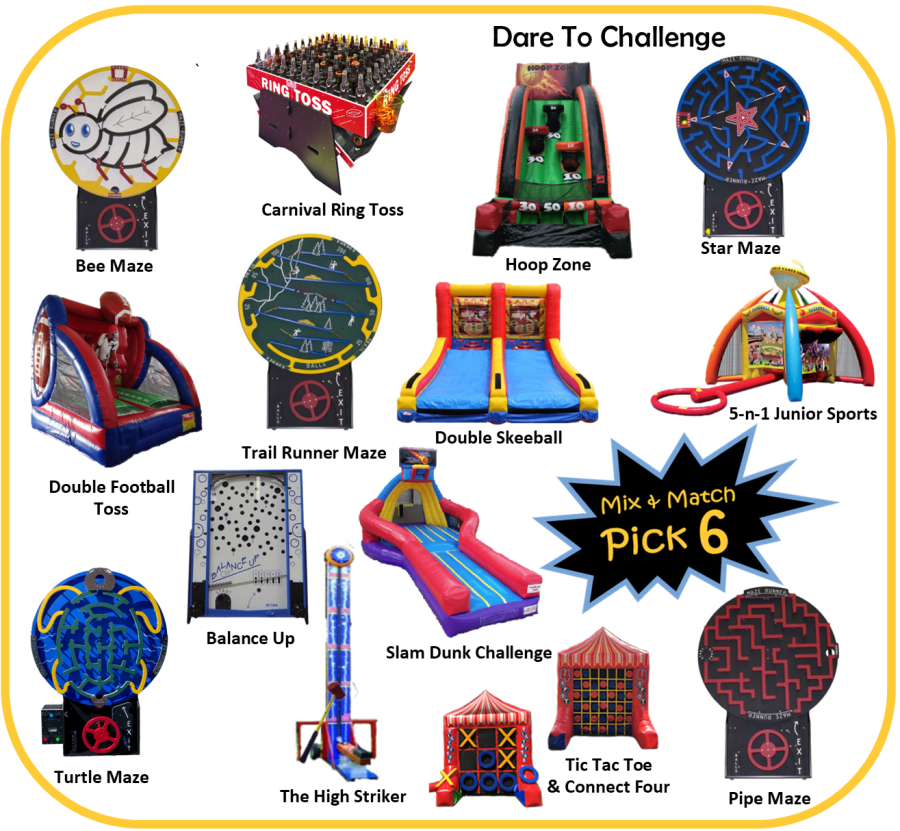 Select from a wide range of fun games, including Bee Mave, Carnival Ring Toss, Hoop Zone, Double Maze, Double Football Toss, Trail Runner Maze, Double Skeeball, 5-in-1 Junior Sports, Balance Up, Slamdunk Challenge, Turtle Maze, High Striker, Tic Tac Toe, and Connect Four.