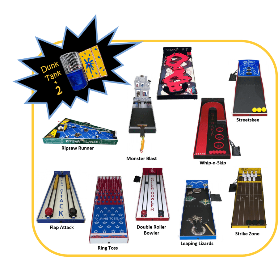 Now is the perfect time to book our popular Dunk Tank Package! When you rent the Dunk Tank, you'll get to choose two Large Carnival Games from our exciting selection: Ripsaw, Monster Blast, Whip-N-Skip, StreetSkee, Flat Attack, Ring Toss, Double Roller Bowler, Strike Zone, and Leaping Lizard. Plus, enjoy a premium Table Package with your rental. The Dunk Tank is a fantastic way to bring the fun and energy of a carnival to your backyard! Please note, water is not included. Choose from our thrilling and challenging carnival games for all ages today!