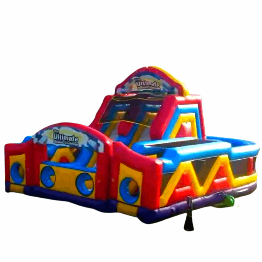 The Ultimate Module Challenge brings everything you love about an inflatable attraction together in one brilliant design! The 3 pieces include a double lane slide with climb challenge steps and tunnel exits and two L-shaped obstacle alleys that include a variety of pop-up, pop-out, log features, rock climb and slide. This piece is perfect for schools, churches, festivals, and carnivals. It keeps the kids going all day and provides an attraction that can accommodate hundreds of kids every hour!