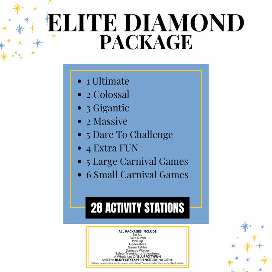 The Diamond Package delivers the ultimate event experience, crafted for those seeking a day of unmatched excitement and joy. With 25 thrilling activity stations, including 1 Ultimate, 2 Colossal, 3 Gigantic, 3 Massive, 2 Big Enough, 2 Small Scale, 6 Dare To Challenge, and 6 Extra FUN activities, your guests are in for a day full of fun, laughter, and adventure. This all-inclusive package covers everything you need, from set up and take down to pick-up, generators, and a damage waiver. We also provide FREE safety training for volunteers, ensuring a smooth and secure event. With the Diamond Package, you’ll enjoy the best of BLUFFCITYFUN and the BLUFFCITYEXPERIENCE, making your event truly unforgettable!