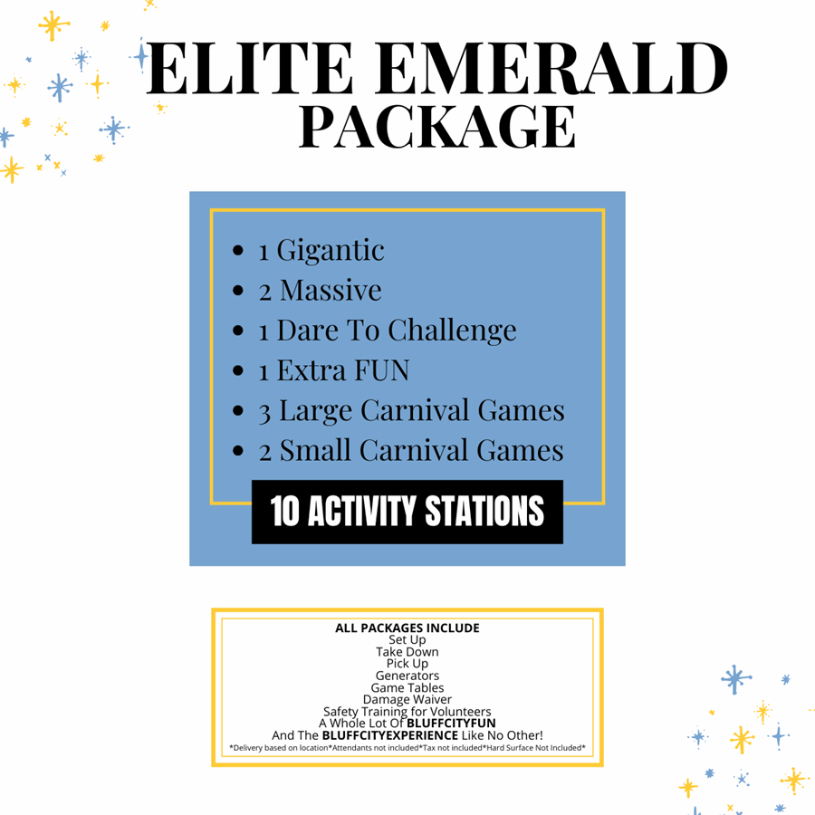 Make your event shine with the Emerald Package, a perfect blend of excitement and charm for your guests. This package includes 7 engaging activity stations: 2 Big Enough, 1 Small Scale, 2 Dare to Challenge, and 2 Extra FUN options, ensuring hours of entertainment. We take care of everything—setup, takedown, pickup, generators, and a damage waiver. Plus, enjoy FREE safety training for your volunteers. The Emerald Package delivers a truly unforgettable experience filled with BLUFF CITY FUN and the unique BLUFF CITY EXPERIENCE, making your event one to remember.